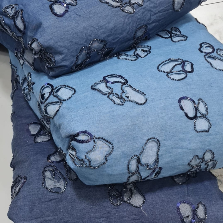 Elevate your fashion game with our Sequin Denim Cutdaana Fabric, a perfect blend of style, sparkle, and strength. Crafted on premium-quality denim base, this fabric features intricate sequin and cutdaana embroidery that adds a rich, luxurious texture and a glamorous finish. Ideal for designer blouses, party wear gowns, jackets, and lehengas, this fabric brings a bold statement to every outfit. Its sturdy denim feel combined with shimmering embellishments makes it both trendy and durable, perfect for modern festive and wedding looks.