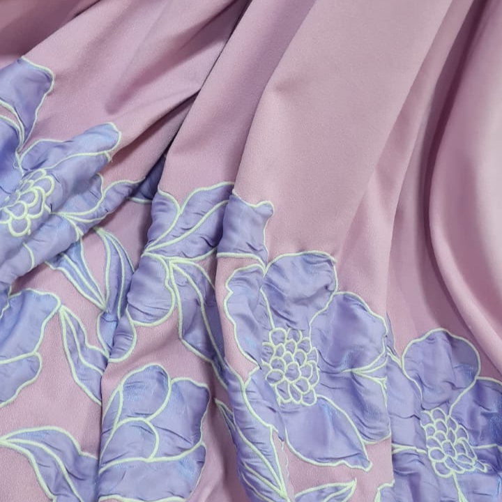 Add a touch of timeless grace to your wardrobe with this mustard yellow fabric, dusty pink and purple beautifully adorned with color floral embroidery along the border. The vibrant contrast of royal blue, sky blue and light lavender threadwork against the mustard yellow, dusty pink and purple base makes it perfect for festive wear, ethnic outfits, and elegant dress materials.